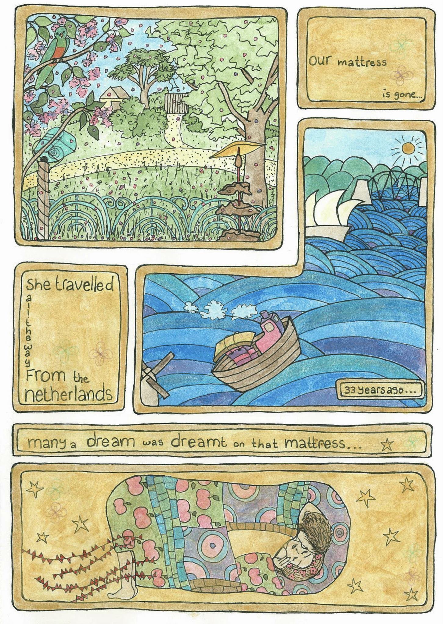 ‘Our Mattress’ page 1- ink, watercolour and pencil.